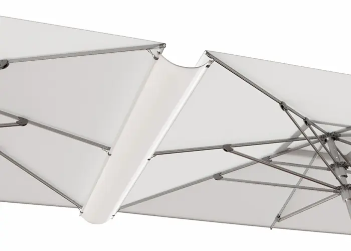 Designed to enjoy rainy days, the rain gutter enhancement precisely joins two parasols with a clip to direct water off the center to the end and keep people comfortable and dry beneath it.
